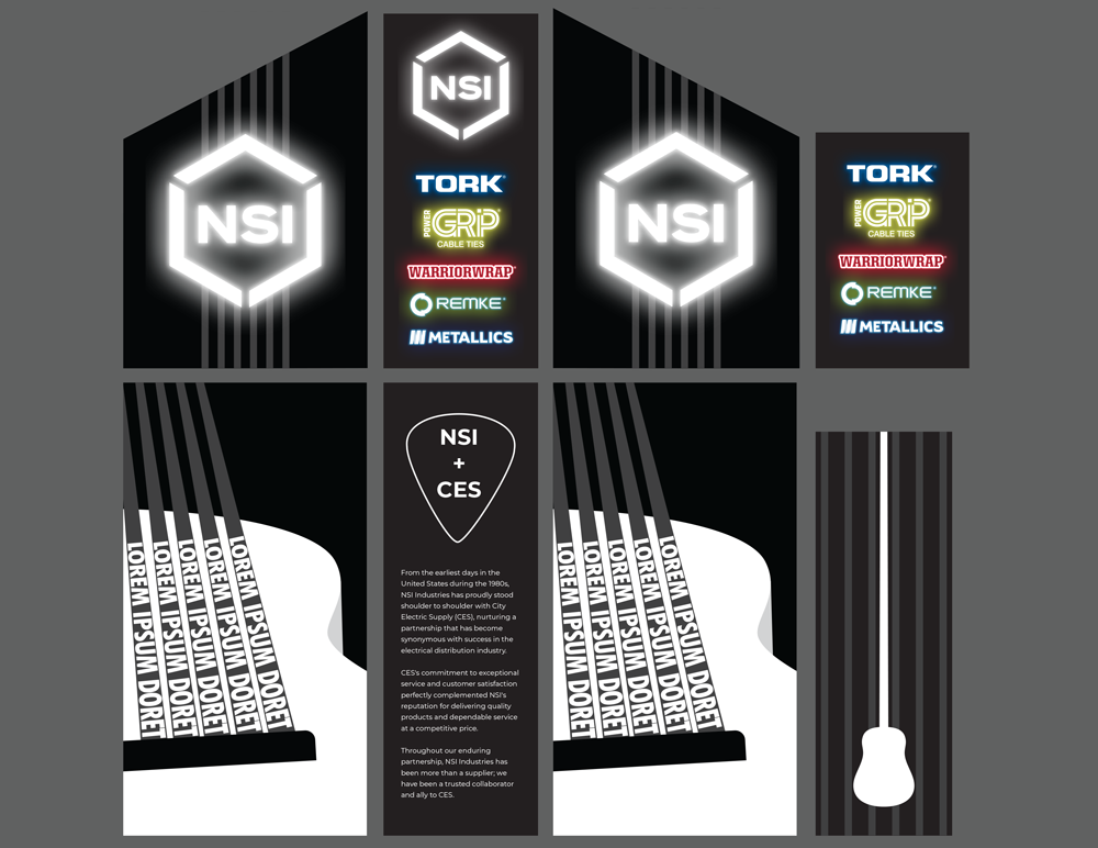 For this project I worked with a team of designers at NSI to create a new, eye-catching and unified look for a trade show booth. I was tasked with designing the main display tower that included products and company information with the trade show’s theme of music all while adhering to the NSI brand identity.