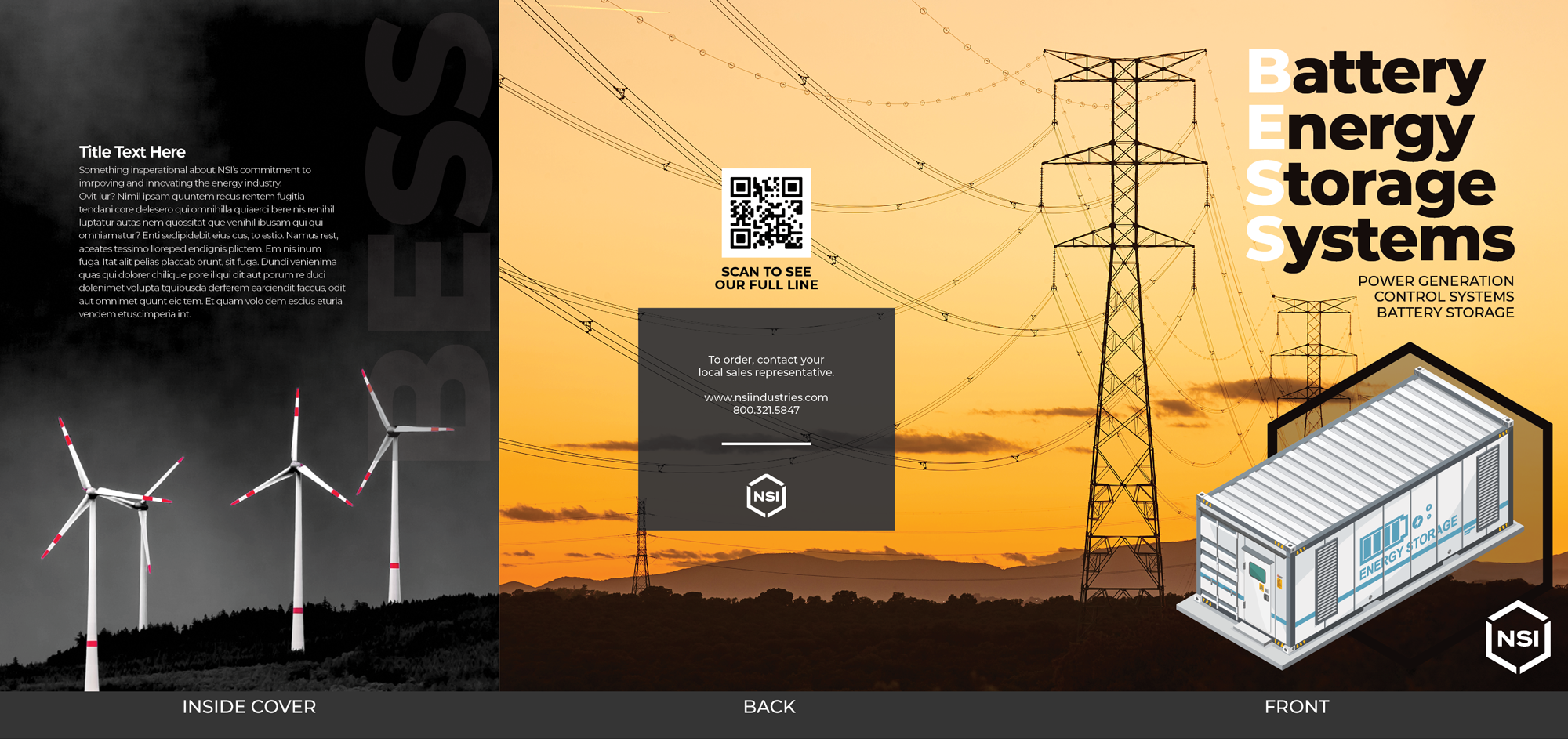 For this project I was tasked with creating a concept design for the cover of a tri-fold brochure for NSI that focuses on the story of energy storage systems and the products involved. The client wanted a focus on the “BESS” buzzword and renewable energy sources. This design was then given to one of their in-house designers to expand upon with a more detailed inside portion.