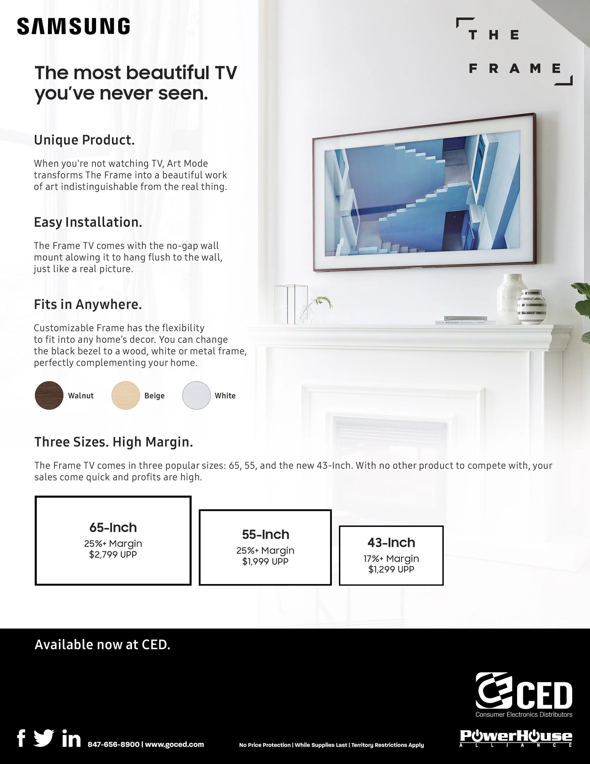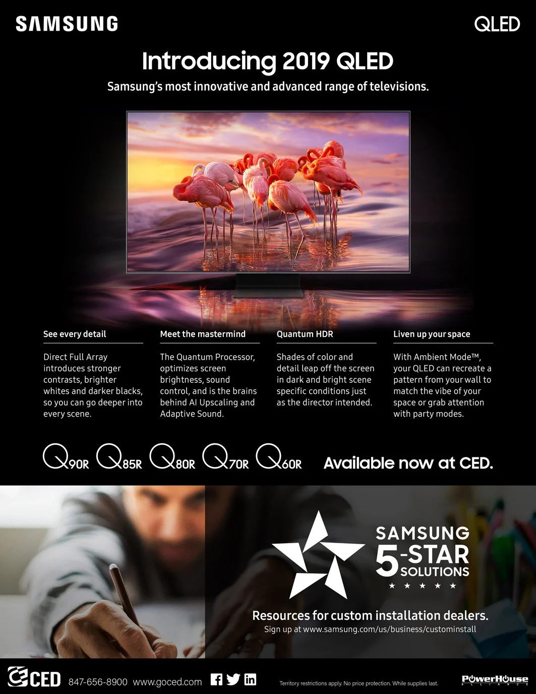 This was an ad series I did while working at CED in 2019. I worked with Samsung and adhered to a design style that used black and white to demontrate the high contrast of their TVs. These flyers were used by sales in distribution and presented to professional instellers and small retailers.